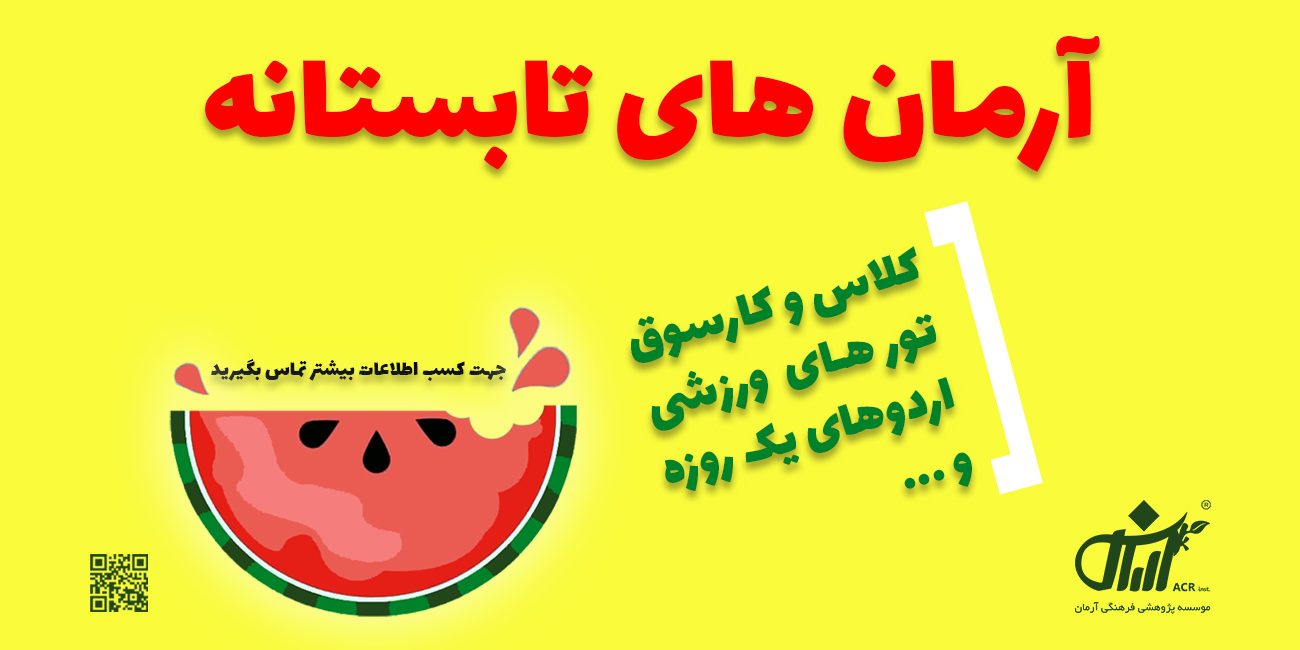 موسسه پژوهشی فرهنگی آرمان به منظور بهره وری هرچه بهتر اوقات فراغت دانش آموزان در تابستان ۹۷ برنامه های متنوعی در بخش هایی همچون برگزاری کلاس ، کارسوق ، تور های ورزشی و اردوهای پر نشاط و آموزنده را برای موسسات ، مدارس و پایگاه های تابستانی برنامه ریزی و اجرا می نماید.